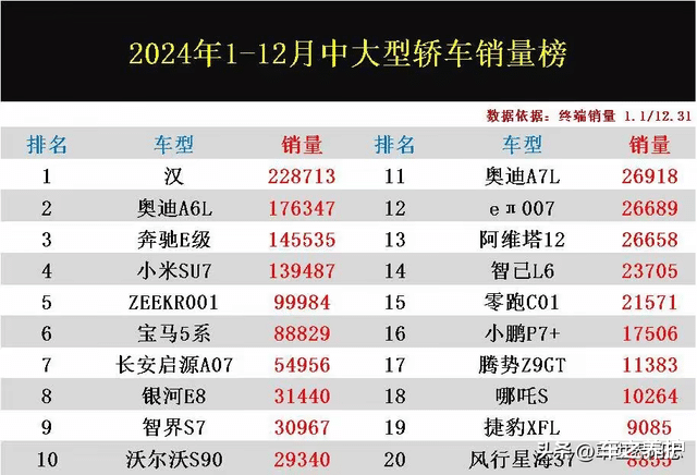 在过去很长时间,国内中大型轿车市场一直被合资和豪华品牌牢牢占据,但随着国产新能源车型的大量退出,以及国内消费趋势的变化,国内中大型轿车市场的竞争格局也发生了较大改变,豪华和合资车市占率和份额大幅下滑,而以比亚迪、小米、极氪为代表的品牌正快速崛起,接下来我们就来盘点一下2024年中大型轿车的销量表现。